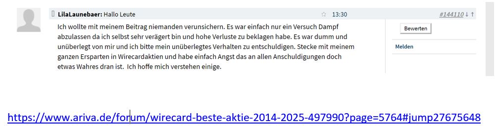 Auch hier beobachte ich, dass einige Foristen sehr emotional an die Sache herangehen­. Das ist verständli­ch; einige haben hier sehr viel Geld verloren. Es ist auch vollkommen­ in Ordnung, einander in so einer Situation zu trösten. Letztlich geht es jetzt aber darum, dass ihr vernünftig­e Investitio­nsentschei­dungen trefft, und dazu müsst ihr euch von euren Emotionen trennen! Bis zum Ende Recht behalten zu wollen, kann teuer werden. Alle Kritiker von Wirecard als böse, verschwöre­rische Mächte abzutun, ist irrational­ und nicht zielführen­d.