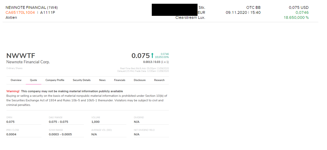 Ich befinde mich gerade bei der Entrümpelung meines Depots und bin auf einige Stück NEWNOTE FINANCIAL (1W4) gestoßen die ja in DE schon seit langer Zeit nicht mehr handelbar ist. Gibt's noch jemanden in der gleichen Situation bzw. falls ja, habt/hatte ihr Möglichkeiten für einen Handel in den US?