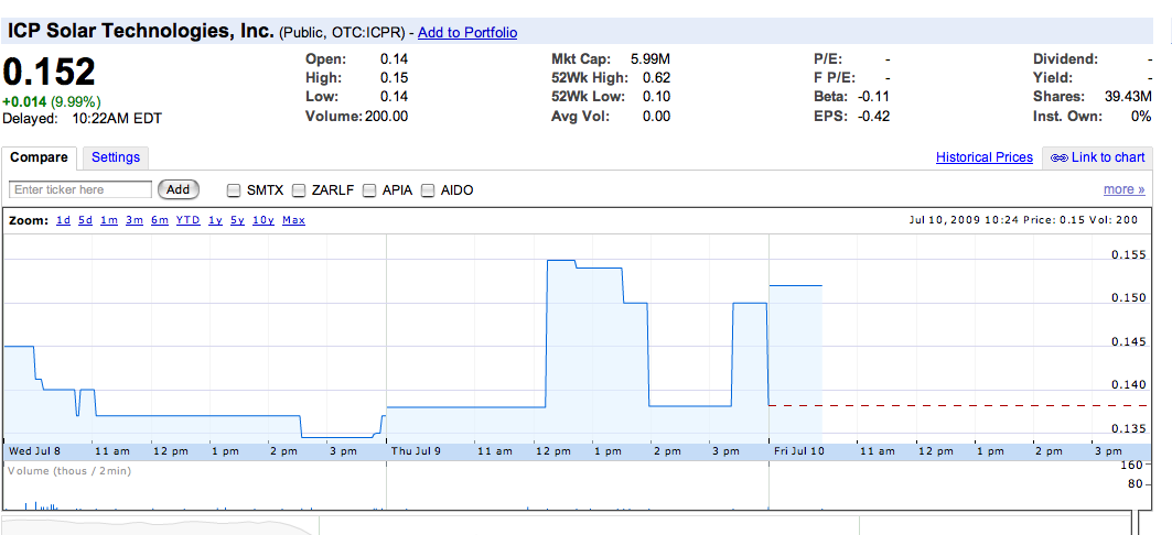 --- ICP Solar Technologies Inc. (OTCBB: ICPR | Quote | Chart | News | PowerRating) opened Tuesday at $0.15 per share on trading volume of 191,028 shares.