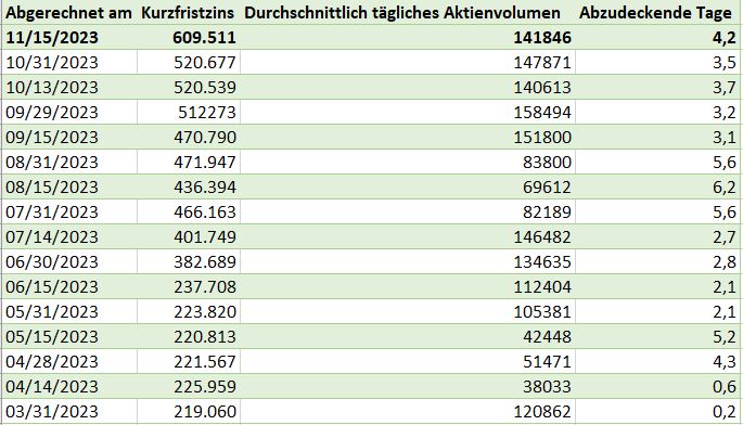 Der Kurzfristzins (gerade bei 609,52 USD) steigt, die Anzahl der Tage zum Rückkauf von geshorteten Aktien (gerade 4,2 Tage) erhöht sich jetzt ebenfalls. Eigentlich ein gutes Zeichen!
