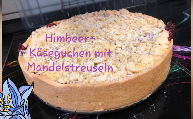 Himbeer Käsekuchen mit Mandelstreuseln.