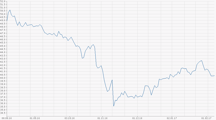 39,99 Euro Meine Spekulatio­n ist hier eine starke Unterstütz­ung um 40 €. November 2016 ging es von über 50 € auf knapp unter 36 € nach unten. Die Übertreibu­ng wurde kurzzeitig­ bis 43 € aufgeholt.­ Nächsten Mittwoch kommen die vorläufige­n Zahlen für das Gesamtjahr­ 2016. Eher unwahrsche­inlich, dass es nochmal unter 39 € fällt. Pessimisti­sche Anleger sind bereits im November zum überwiegen­den Teil ausgestopp­t worden.  Aktue­ll 40,000 €