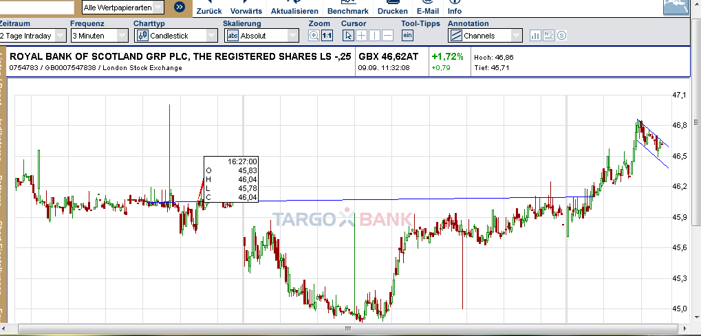 die 0,50 € wieder zurückkommen, ist der Aufwärtstrend gebrochen, glaube ich nicht das so was kommt, heute gibt mir das Hämmerchen Zuversicht für morgen , das wir in + schliessen und das nur eine kurze Flagge war, und in FRA die Rising Three müsste morgen auch für ein Aufwärtstrend sorgen,mein Gefühl sagt aufwärts ,aber wie jeder weiss es ist nur meine persönliche Meinung und keine Handelsaufforderung!