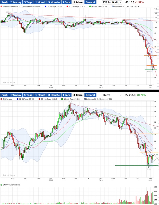 Das 3-Jahres-Chartbild (vom Dienstag, 20.01.15 - Öl oben, OMV unten):