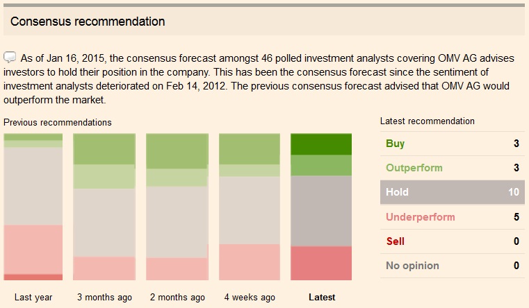 Am 16.01.2015 gaben 46 Finanzanalysten, die den Wert OMV unter Beobachtung haben, ihre Prognose zur weiteren Entwicklung der Aktie ab.
