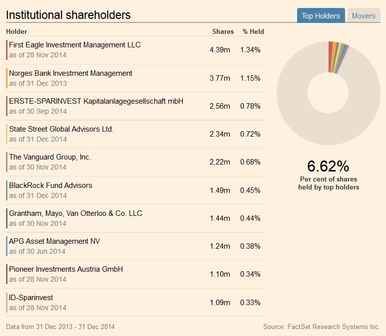 Zum 31.12.2014 halten die großen institutionellen Anleger insgesamt 6,62 Prozent der Aktien an dem Unternehmen.