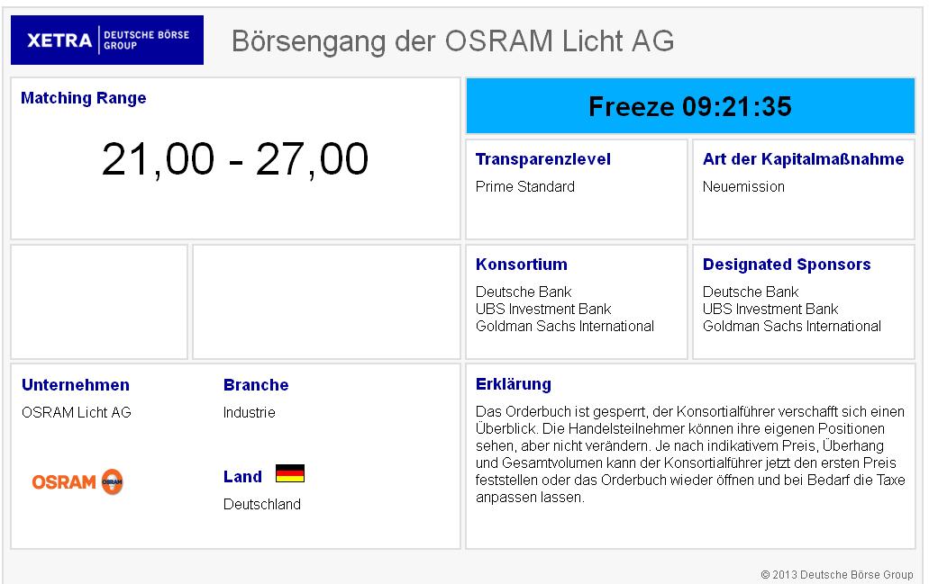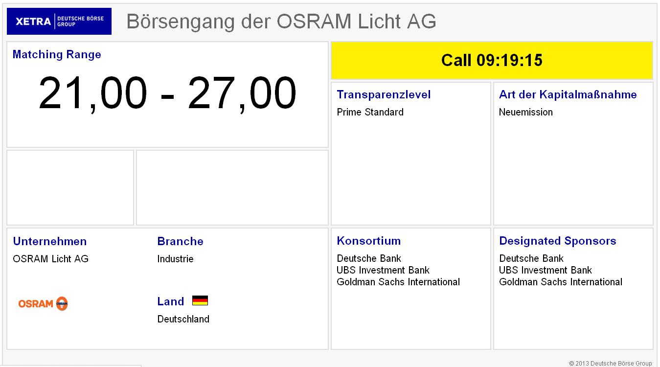 Die OSRAM Licht AG startet heute unter dem Börsenkürzel "OSR" an der Frankfurter Wertpapierbörse und an der Börse München in den Handel. "Das heutige Listing schlägt ein neues Kapitel in der über 100-jährigen Unternehmensgeschichte auf und eröffnet große Chancen für die künftige Entwicklung des Unternehmens", so der Osram-Vorstandsvorsitzende Wolfgang Dehen. Das Management war zuletzt auf Roadshow an wichtigen internationalen Kapitalmärkten und hatte bei rund 400 Fonds und Banken für Osram geworben.