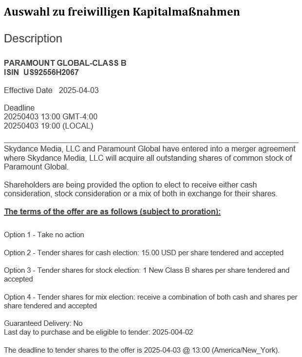 Aktie wegen einer Fusion in die New Paramount per 07.08.2025, gem. Beschluss