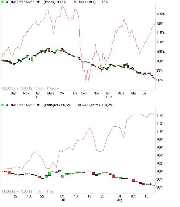 Also dieser Fond scheint ja der totale Flop zu sein. Von welchem dilettantischen Totalversager wird denn diese Geldverbrennungsmaschine betreut? Angesichts der saftigen Management Fees ist die Performance der totale Witz. Naja, der Fondbetreiber macht sich wenigstens die Tasche voll mit den Gebühren. Aber welcher intelligente Mensch läßt da weiter sein Geld verschimmeln? Leider wieder so ein typisches Godmodetrader Progaganda-Produkt wo Harald Weygand und seine Drücker auf ihrer Homepage groß trommelten und so gutgläubige Naivlinge reingescheucht hat. Mit jedem 08/15 DAX Index-Zerti wäre man seit Auflage des Fonds besser gefahren bei einem Bruchteil an Gebühren. Also Vorsicht wenn wieder Godemode irgendein neues Abzock-Produkt auflegt und sich selbst in höchsten Tönen lobt. Die Dummen sind die Investoren, dicke Taschen hat am Ende nur Weygand&Co. Wenn die Jungs so tolle Börsianer wären, dann bräuchten die nicht ihre "Jünger" zum abmelken mit Abos, Fonds und sonstigen Produkten, sondern könnten sich gemütlich zurückziehen und von ihrem Reichtum in Ruhe leben, den man als erfolgreicher Börsianer hätte. Von daher immer Vorsicht vor Seiten mit selbsternannten "Experten" die einem was verkaufen wollen.