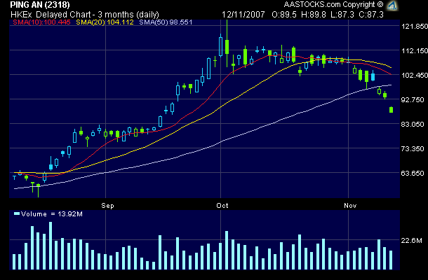 Ping An Insurance (02318) The Group spent Euro 1.81 billion to buy 4.18% of Belgium's Fortis Bank. This is the Group's first overseas investment. This marks a trend for China financials to break out of China and into the world. The market's response is positive. Buy $83.00 Target $100.00 , Cut loss $75.00
