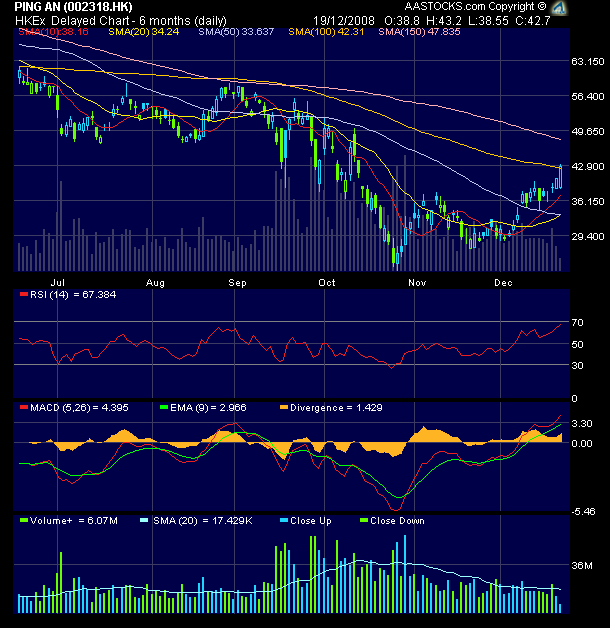 We revised the FY08 and FY09 NP to Rmb 24.37bn and Rmb 28.65bn respectively, up 30.25% and 17.68%. Translated into 15.7X and 13.32X 2008 and 2009 forecast PER, respectively. (If accounted for the proposed new A-share issuance, 2008 and 2009 PER will increase to 20.79X and 17.68X respectively). Ping An share price has been corrected for more than 50% and we believe the current price has already factored in the worries over its huge A-share issuance plan and the drop in FY08 investment returns. China insurance market remains on its high growth stage.Ping An deserves a higher rating for its innovative and aggressive strategies in penetrating the lucrative rural insurance market. We give it a BUY rating with a 6-month TP of HK$75, representing 20X on FY¢¯8F EPS.