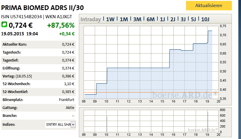 Sydney / Leipzig, 19. Mai 2015 - Prima BioMed Ltd (ISIN US74154B2034 ) gibt