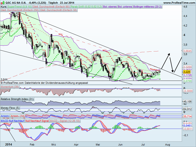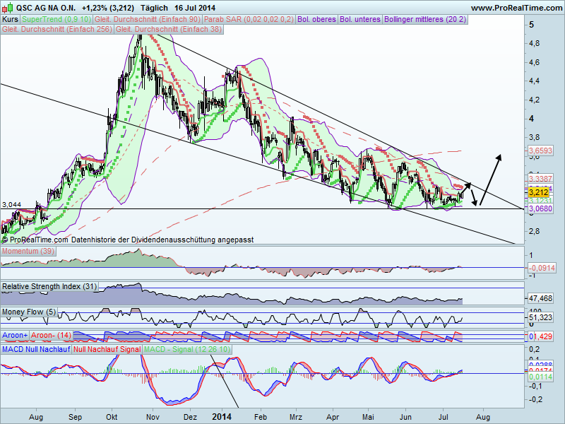 steht weiterhin aus. Momentan ist eher noch die Frage, ob man einen Boden wirklich schon gefunden hat oder nicht. Alleine das Gerücht über den möglichen Netzverkauf an UI hatte den Kurs gehoben. Ansonsten kam aber noch nichts an wirklich neuen Fakten was eine positive fundamentale Entwicklung in 2015 belegt. Entscheident dürfte somit sein, ob QSC eine glaubhafte und nachhaltige Turnaround-Strategie in Kürze vorstellen kann. Dann könnte man die Widerstandsregion 1,80/2,00 rausnehmen. Schlecht sähe das Bild wieder aus, wenn man nachhaltig unter die Region 1,64/66 zurückfallen sollte. Von daher sitzt der Kurs aktuell erstmal weiter zwischen Baum und Borke und braucht neue fundamentale Impulse um nachhaltig Schub zu bekommen.