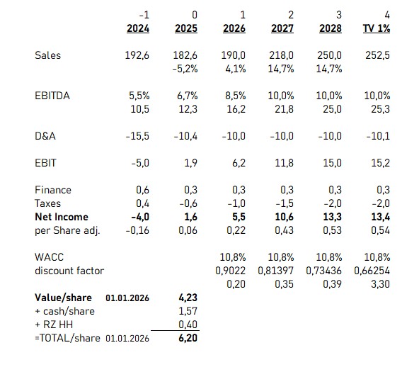 Wenn man in der Präsentation für 2026 Prognosespannen ( Umsatz / EBITDA) einarbeitet, die unterhalb der Werte für 2025 beginnen (siehe Grafik), dann muss man sich natürlich auch nicht wundern , wenn die Investoren erstmal abwarten. Hier muss unbedingt ein Investor her, der wenigsten mal 500K € in die Hand nimmt und über 100K Stücke aufnimmt.