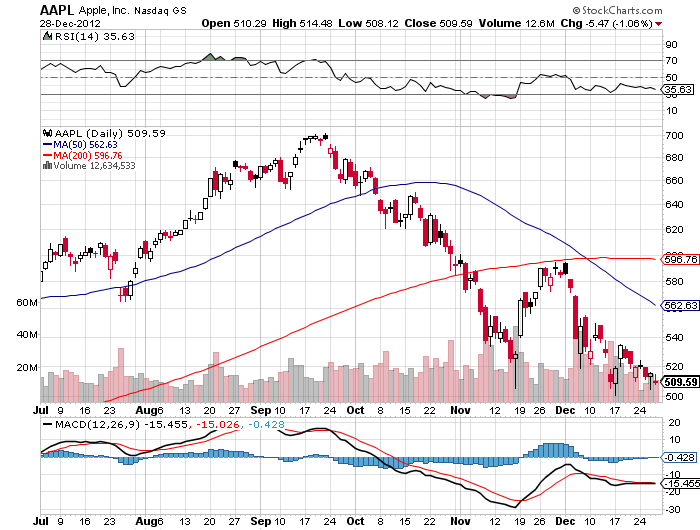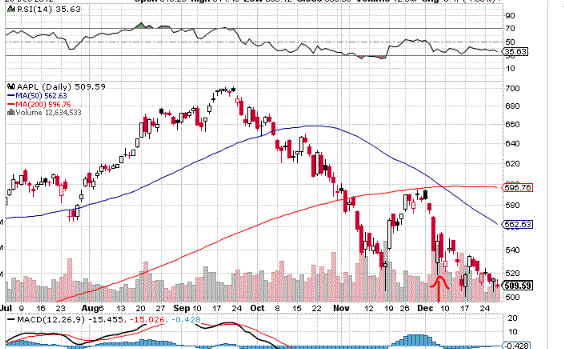 Als Apple Mitte Nov. bei 544 Dollar stand, hatte ich einen "Dead Cat Bounce" an die 200-Tage-Linie bei 590 Dollar vermutet. Tatsächlich stieg Apple in den nächsten zwei Wochen und drehte bei 595 erneut nach unten.