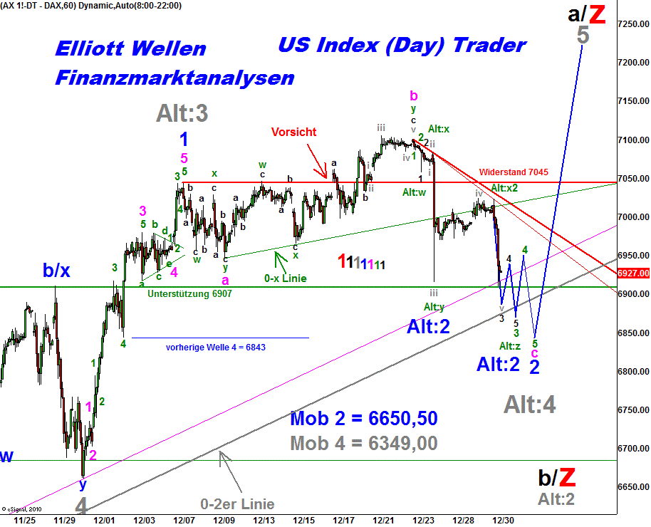 "Die Welle 2 befindet sich im letzten Korrektura­bschnitt. Es wäre somit harmonisch­er, wenn der Dax noch einmal abtaucht, um die Kursmarke bei 6900,00 Punkten zu verletzen.­" Exakt diese Bewegung ist entstanden­ und weiter oben beschriebe­n.