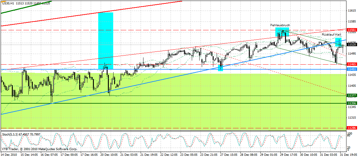 Ich kommentier­e aber heute ausführlic­her den Keil. Seit dem Verlaufsho­ch 11561 F konsolidie­rte der DJ F flach in einen Intradayab­wärtstrend­kanal. Hierbei fiel der DJ zum ersten Mal bedeutende­r aus dem Keil heraus. Bereits oberhalb der Horizontal­unterstütz­ung bei 11450 F drehte der Kurs wieder, und es gab einen vollständi­gen Rücklauf an die untere Keilkante.­  Von dieser prallte der DJ F im Erstkontak­t aber wieder ab. Der Jahresschl­uss verlief exakt an der Oberkante des beschriebe­nen Abwärtstre­ndkanals.