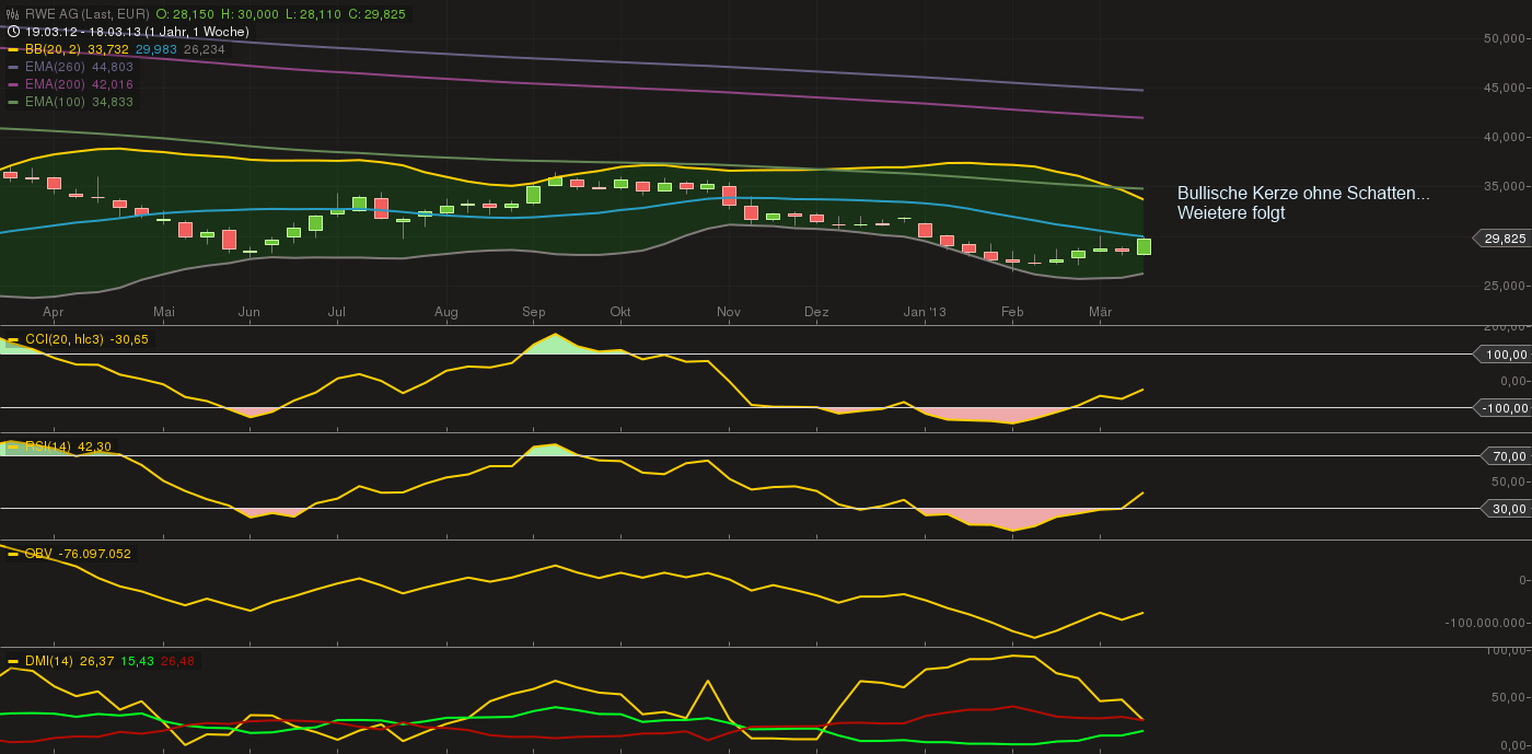 Auf Wochenbasis haben wir eine schöne, grosse bullische Kerze ohne Schatten....normalerweise folgt daraufhin eine weitere schöne grüne Kerze...Ziel wäre für mich die 31,70 nächste Woche und dann oBB bei 33,50 draufhin....mal schaun, ob das so zutrifft...Die Signale sind schon mal steigend...