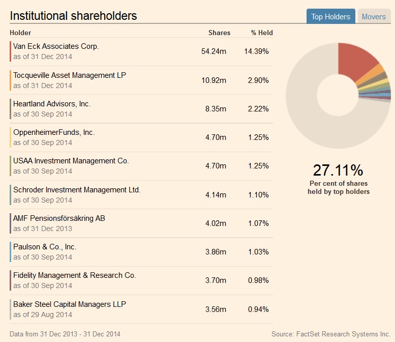 Zum 31.12.2014 halten die großen institutionellen Anleger insgesamt 27,11 Prozent der Aktien an dem Unternehmen.