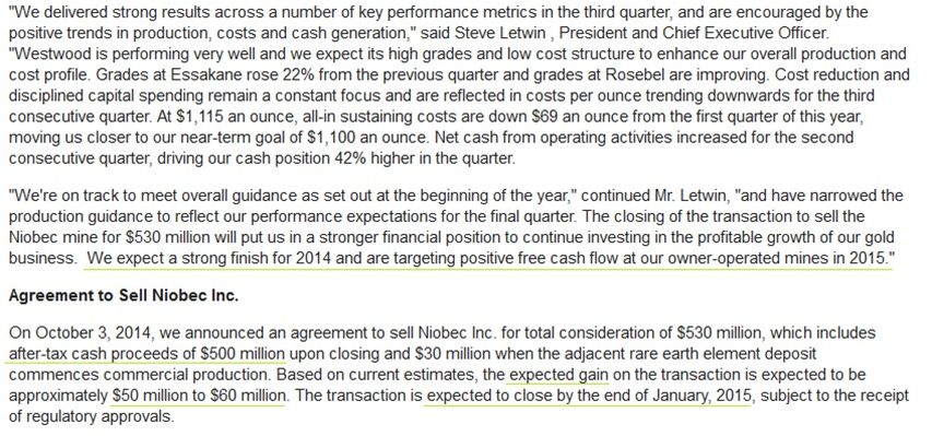 Man bekommt im Moment alle Goldminen der Firma umsonst :-D ( wenn man den Verkaufspreis des Niobec Projektes und die Cash Reserven addiert)