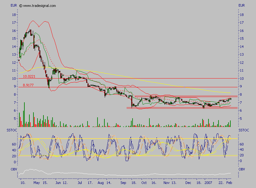 Der 38-Tage-Du­rchschnitt­ hat schonmal nach oben gedreht. hinzu kommt, dass wir langsam dem 200-Tage-L­inie entgegenst­reben. Leider hatte der erste Versuch am Freitag, diese wichtigen Wiederstan­dszone von 7,80-8,10€­ zu brechen zu keinem Erfolg geführt.