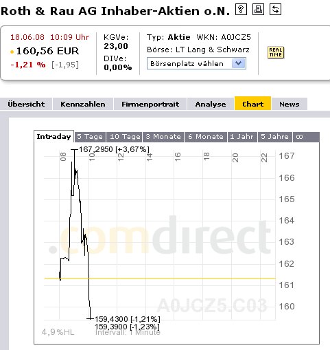 Der Solarindustriezulieferer Roth & Rau (+ 4,8 Prozent auf 161,88 Euro) setzt seine am Montag gestartete Erholung fort.