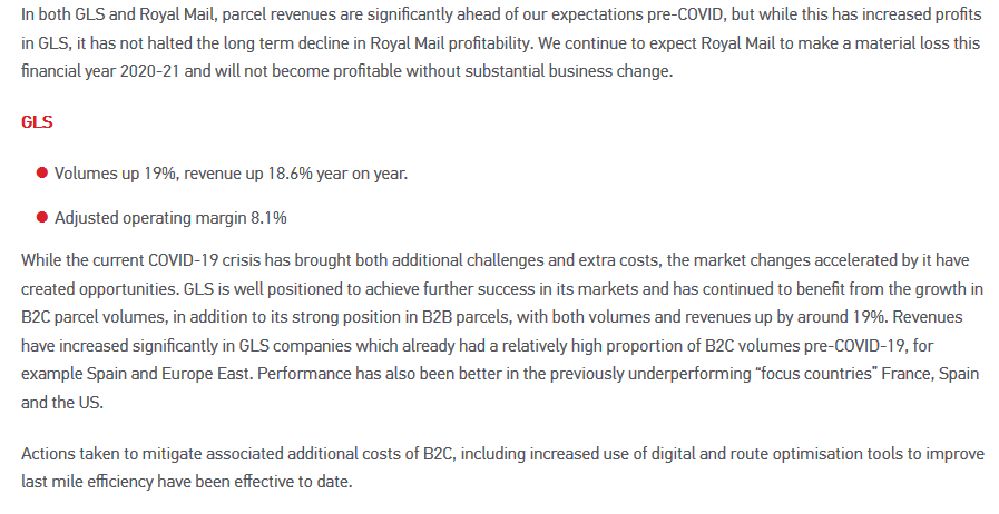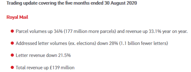 ..."In a trading statement on the day of its AGM the company said parcel volumes surged 34% in the five months to the end of August."