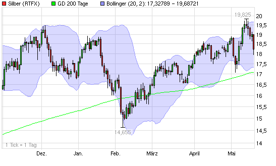 Der Kurs dürfte kurzfristig bis 17,5 nachgeben. Wenn dann sichtbar wird, dass auch dieses mal das untere Bollinger-Band halten wird, dürfte es m.E. wieder flott auf knapp 20 gehen.