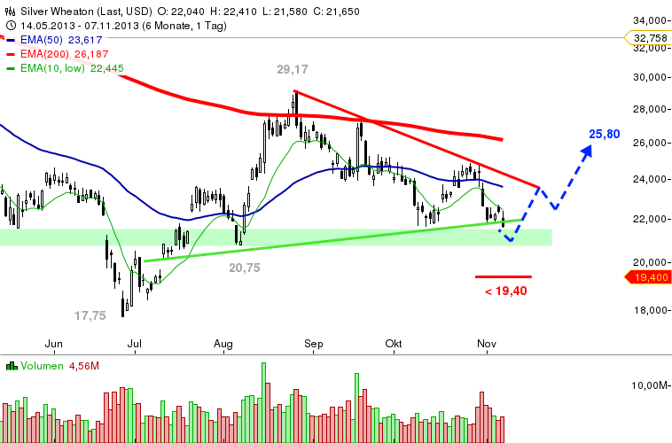Die Silver Wheaton-Aktie legt sich gerade ins Zeug, um ein Fehlsignal zu produzieren. Denn mit dem Ausbruch aus dem Dreieck nach unten wird normalerweise ein Verkaufssignal generiert. Doch genau hier setzt dieses Szenario an. Die "schwachen" Markteilnehmer werden aus der Position gedrückt und schauen dann später zu, wie die Aktie zu steigen beginnt und sind dann genau die Leute, die auf den fahrenden Zug aufspringen werden und die Aufwärtsbewegung beschleunigen. Natürlich ist die Prognose gewagt, aber die Wahrscheinlichkeit ist meiner Meinung nach relativ hoch.