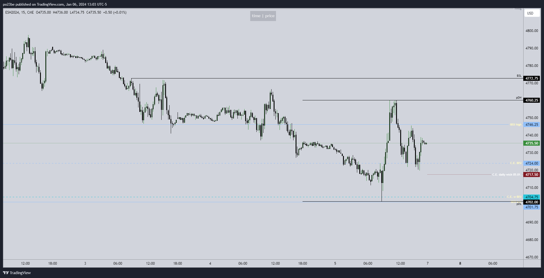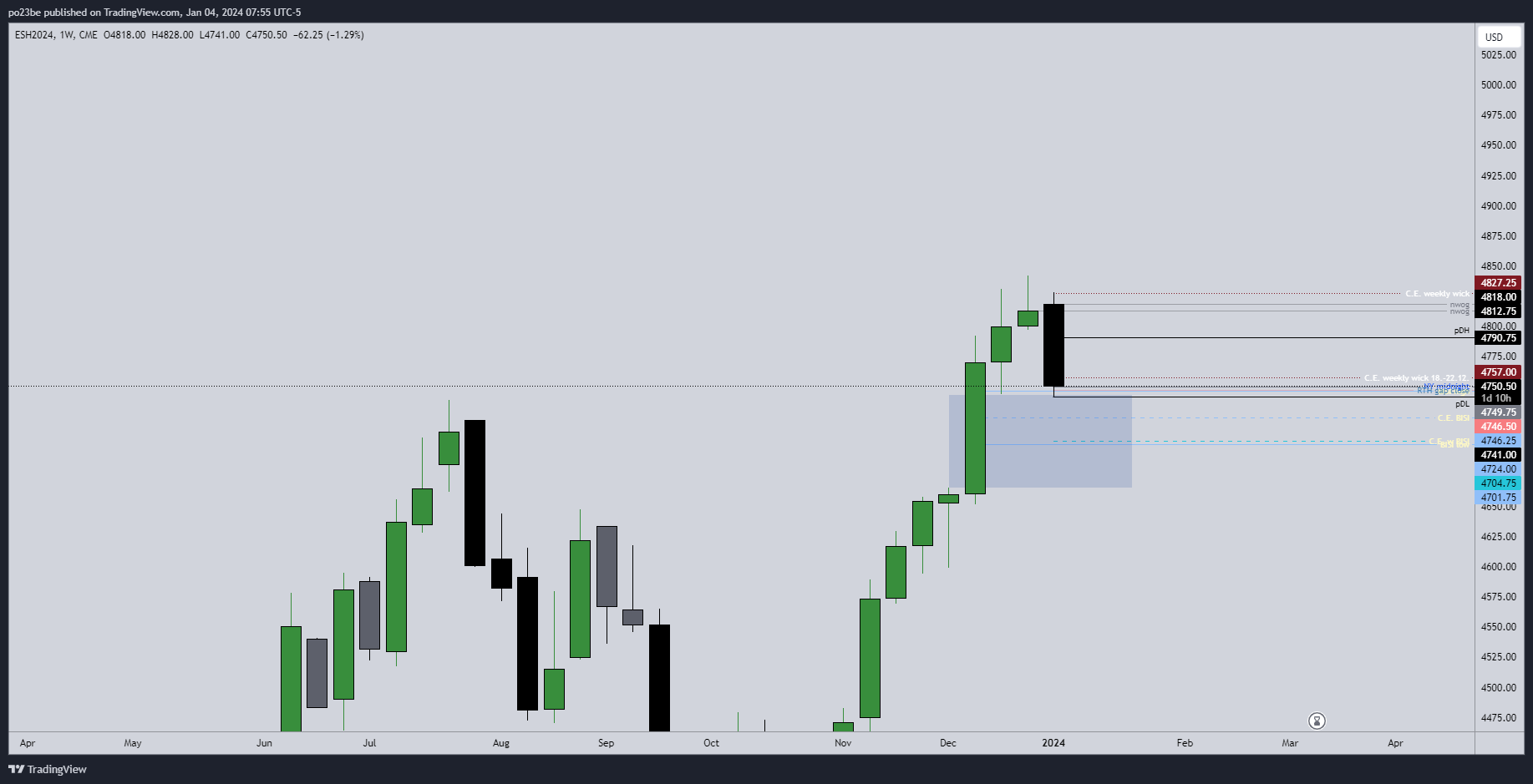 ES ist gestern in dieses weekly BISI gekommen. Glaube, dass er bisschen noch runter sollte (kein closing unterhalb für weiter hoch). C.E. sind bei 4704,75.