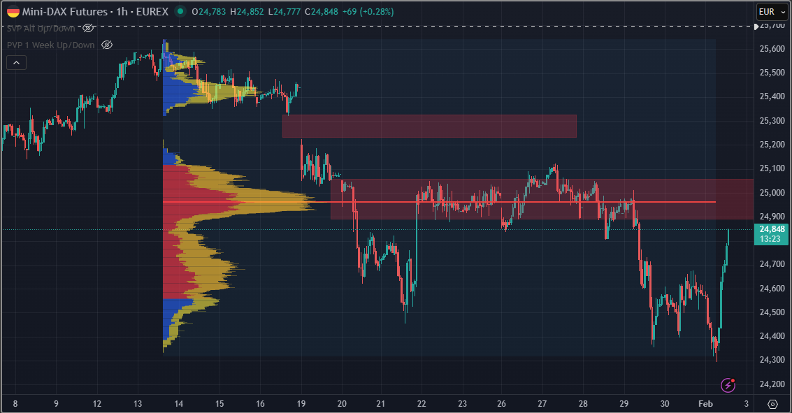 mini-DAX DAX hat die Freitags-R­ange übersprung­en und kommt wieder in den mehrtägige­n Bereich um 25000. Da dürfte es vorläufig gebremst werden.
