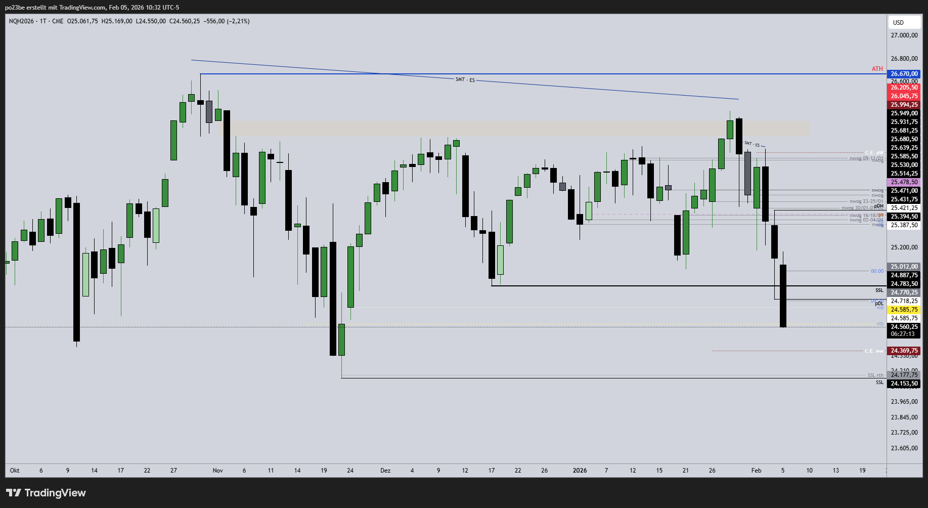 NQ Januar ist vorbei, deshalb wieder die Monats-Cha­rts zur Orientieru­ng. Alles zwischen dem ATH und etwa 24500 ist in der grossen Sicht Seitwärts-­Range. In solchen Bereichen stelle ich immer wieder grössere Bewegungen­ in beide Richtungen­ fest. Würde mich nicht überrasche­n, wenn wir wieder Richtung Januar Hoch gehen würden.