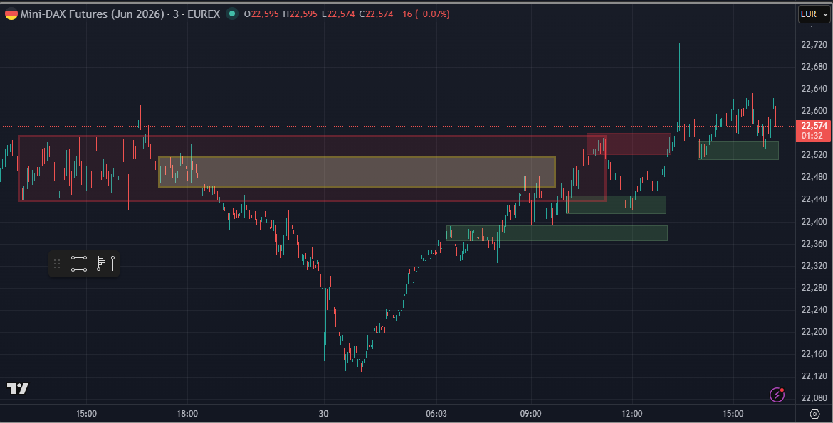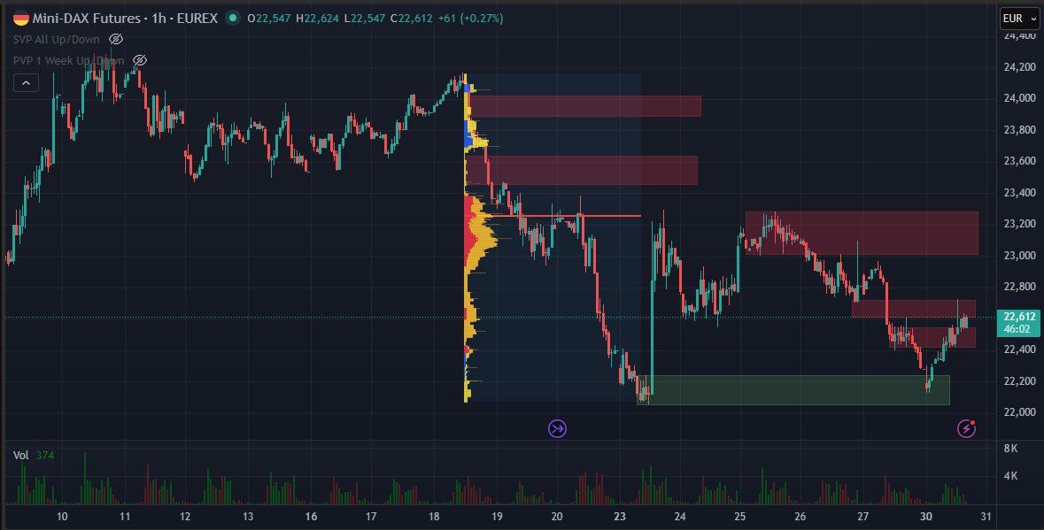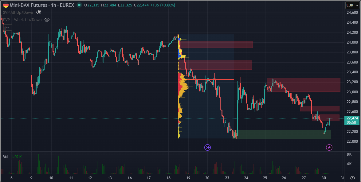 Um den Verlauf etwas detaillierter zu betrachten braucht es eine kleinere Auflösung. Für mich ist es wichtig, die Bereiche mit hohen Volumen (Konsolidierungen) und Bereiche mit wenig Volumen (Imbalance, starker Druck von Käufern oder Verkäufern) zu lokalisieren. Heute kurz von 14:30 dann wieder ein starkes Reversal oben, das es für den weiteren Verlauf zu beachten gilt. Es sind diese Bereiche, in welchen man sich für einen Trade entscheiden kann.