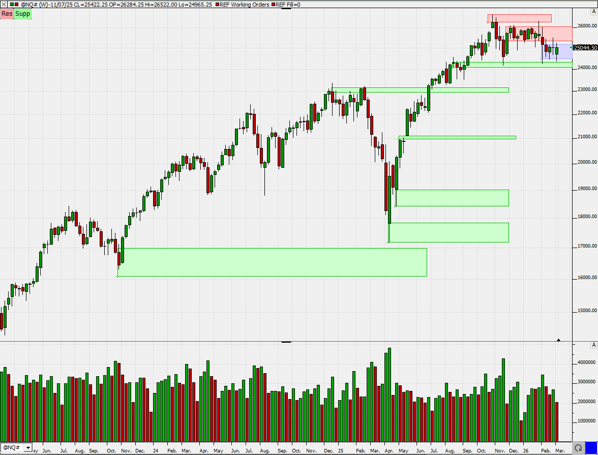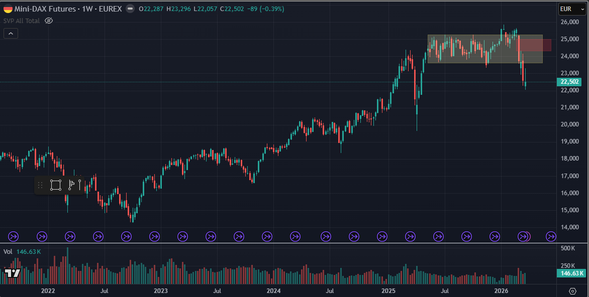 Bald ist Monatsende und wir haben wieder ein neues Monatstief gemacht. Bisher hat er sich die vorangegangenen Tief wieder geholt. Das wären beim Stand heute etwa 500 Punkte, meist ging es noch ein Stück darüber. Wir sind auch in einer Support-Zone angelangt, deshalb glaube ich bald an eine eine Gegenreaktion. Im Bereich der Donnerstagskerze dürfte es schwieriger werden. Knapp unter 24000 liegt auch das Vorwochentief. Das Februartief liegt noch etwas höher, das wird man später beurteilen müssen, ob es dazu auch noch reicht.