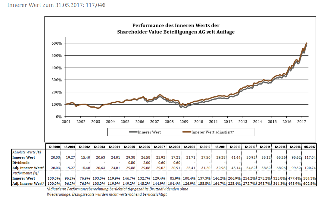 Bei der Grafik ist zu beachten, dass Frank Fischer die Verantwortung bei der Shareholder Value Beteiligungen AG erst zum 1.1.2010 übernommen hat. Der Wert damals war 21,71 Euro (und der Börsenkurs lag bei 17 Euro). Heute liegen innerer Wert und Börsenkurs bei ca. 117 Euro. Das entspricht 25% Wertsteigerung p.a. über 7,5 Jahre (bzw. 29% beim Aktienkurs). Das nachzumachen ist nicht ganz trivial!