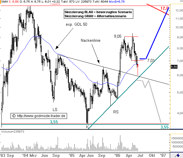 Rückblick: Die SÜSS MICROTEC Aktie markierte Ende März 2003 ihr Allzeittief bei 1,18 Euro. Danach kam es zu seiner rasanten Aufwärtsbewegung bis 12,60 Euro. Nach diesem Hoch aus dem Februar 2005 fiel die Aktie wieder massiv zurück. Erst die Unterstützung bei 3,55 Euro bot genügend Halt. Bereits ab dem Tief bei 4,50 Euro aus dem August 2004 befand sich die Aktie in einer Bodenbildung in Form einer inversen SKS. Im Januar 2006 brach die Aktie über die Nackenlinie nach oben aus, was zu einem mittelfristigen Kaufsignal führte. Danach stieg die Aktie zunächst einmal bis 9,05 Euro an. Anfang Mai scheiterte die Aktie an diesem Hoch, obwohl sie es kurzzeitig schon überwunden hatte. In der letzten Woche fiel die Aktie unter das Zwischentief bei 7,01 Euro ab. In dieser Woche erreichte sie die Kreuzunterstützung aus langfristigem Aufwärtstrend und Nackenlinie der SKS. Auf dieser Unterstützungszone zwischen 5,97 und 5,81 Euro kommt es zu einem bullischen Wochenreversal und einem Hammer als Kerze.