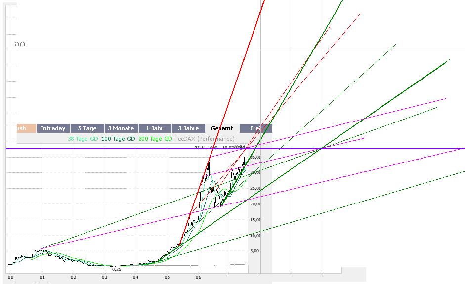 Sollten die Märkte stablil bleiben, d. h. die Liquiden Mittel bleiben erhalten und die Gesamtstimmung bleibt gut, was zur Zeit ganz klar der Fall ist, ist Solarword auf der Bodenstufe 35 Anfang 2010 zu sehen. Der Deckel aber .. und das ist hier nicht von der Hand zu weisen liegt bei 70 (Mitte 2009!) wenn man keinen progressiven, sondern tiefgestapelt einen linearen Langzeitverlauf voraussetzt!