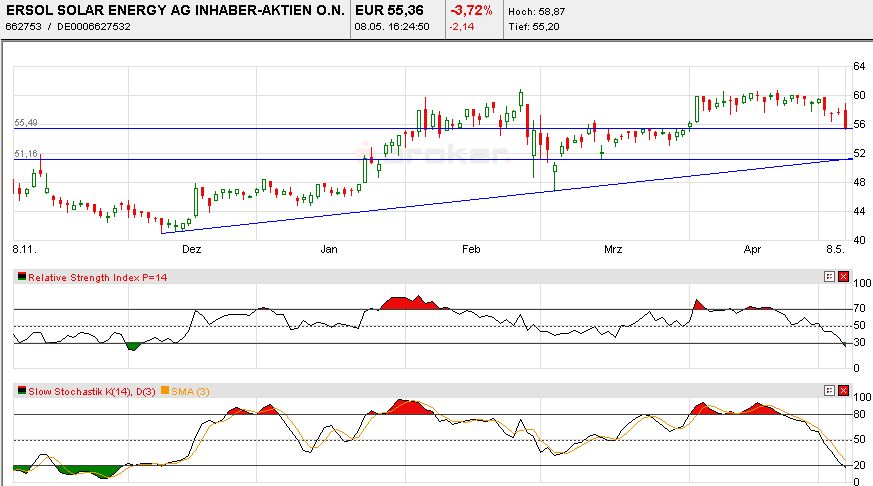 bildet Ersol heute das Schlusslicht im TecDax. Hatte nach dem Trend in den USA auf eine Überwindung der 60er Widerstandslinie gehofft, denn dann ist Luft nach oben.