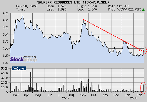 Es ist auch eine Aktie mit Geduld und Spucke...d­och wenn man sich vor Augen hält, wer hinter Salazar Resources steht und was dieser Mann die letzten Jahre gemacht hat, dann wird man schnell vom Pessi- zum Optimist ;-)