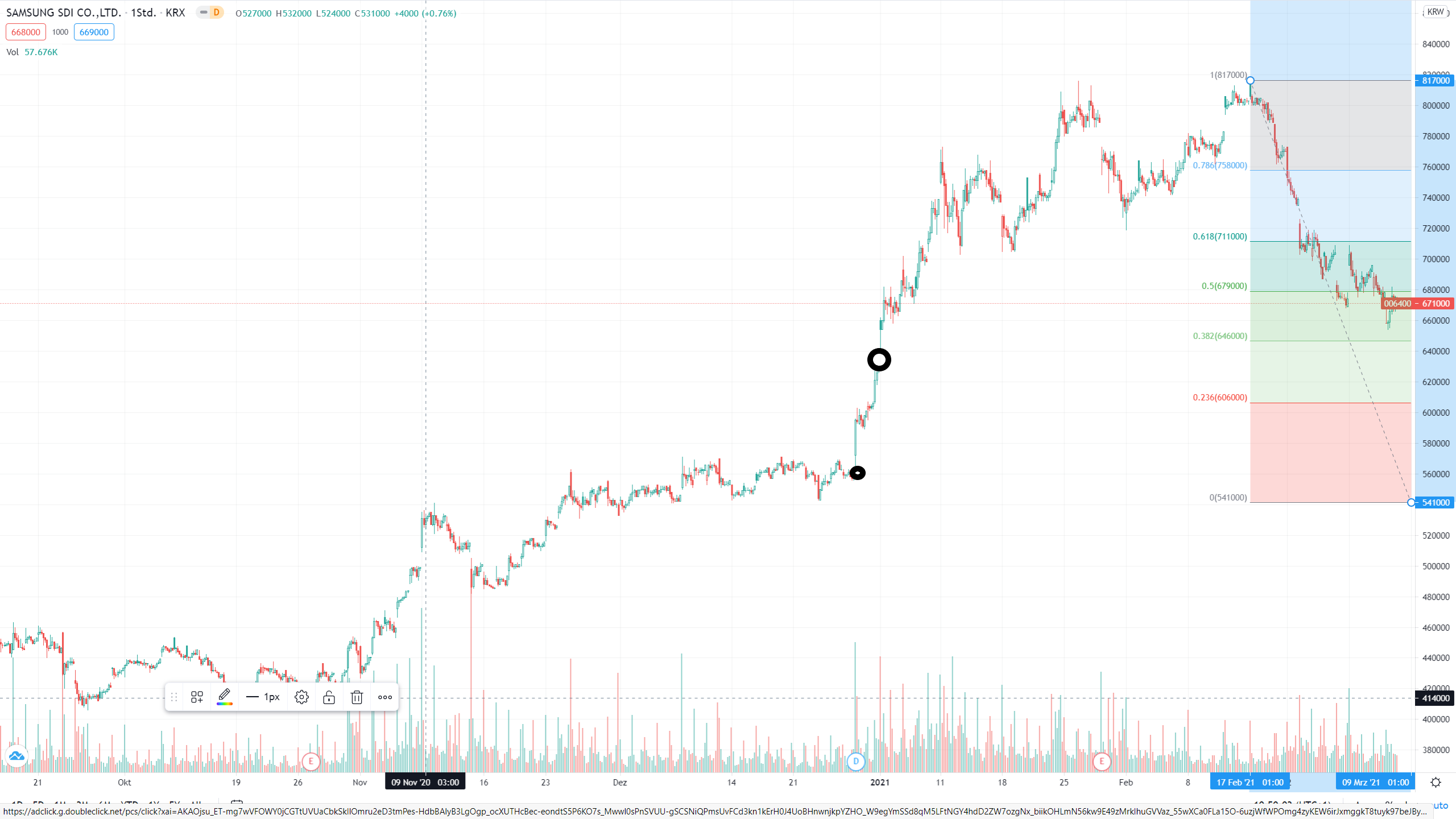 Aber, der Chart in Korea (auch in US) hat noch zwei Löcher und anhand des laufenden Patterns kann man nicht erkennen, ob er ein, beide oder erstmal gar keines zumachen will.