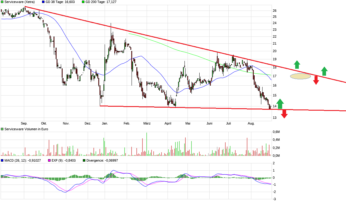 Wie gesagt, normalerweise müsste man unterhalb 13,7 € ein SL setzen, aber mir wird's dann fundamental zu günstig, wenn es darunter nochmal einen Abverkauf geben würde.