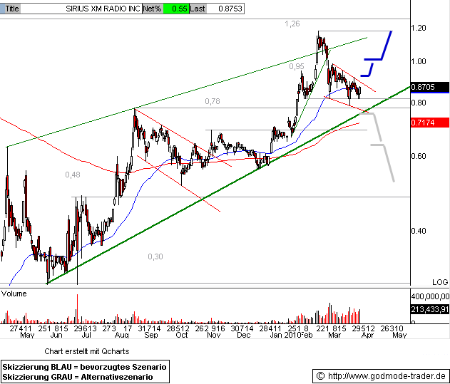 Rückblick: Die Sirius XM Radio Aktie erreichte nach einer steilen Kursrally ein Mehrjahreshoch bei 1,18 $ Mitte Februar und setzte anschließend deutlich bis den Unterstützungsbereich bei 0,78 - 0,82 $ zurück.