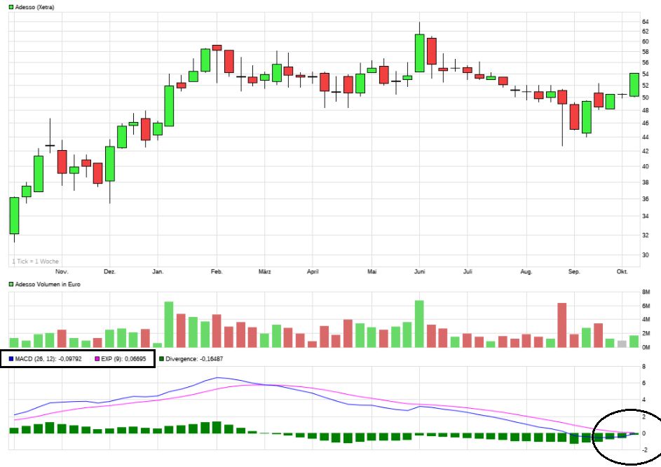 Die Aktie von Adesso könnte bald charttechnisch ins positive vorrücken. Der MACD steht unmittelbar vor einem Kaufsignal nach eine nun doch längeren Korrektur könnte der MACD ins positive drehen.