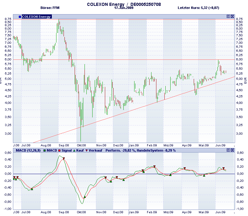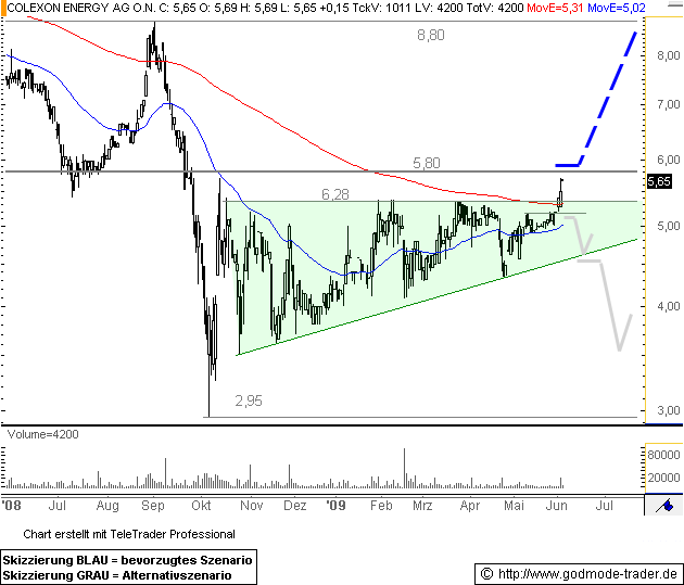Rückblick: Die Colexon Aktie rutschte im Herbst 2008 massive bis auf 2,95 Euro ab, wo im Oktober eine Kurserholung startete. Die Aktie pendelte sich schließlich seitwärts ein, wobei die Verlaufstiefs jeweils höher gelagert waren. Die starke Erholung der vergangenen Wochen im Gesamtmarkt konnte die Aktie nicht mitmachen, erst in dieser Woche gelingt ein Anstieg über die Hochs der letzten Monate bei 6,28 Euro.