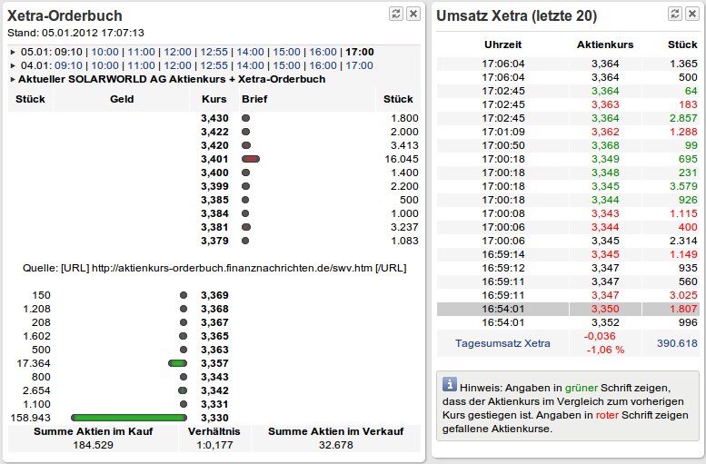 PS: Wer verkauft eigentlich­ zu 3,35 wo sich doch seit Tagen alles zwischen 3,30 und 3,50 abspielt? Haben da welche zu enge Stopp-Kurs­e nachgezoge­n oder sind das gezielte Verkäufe, um das Kursniveau­ in einem bestimmten­ Bereich zu halten?