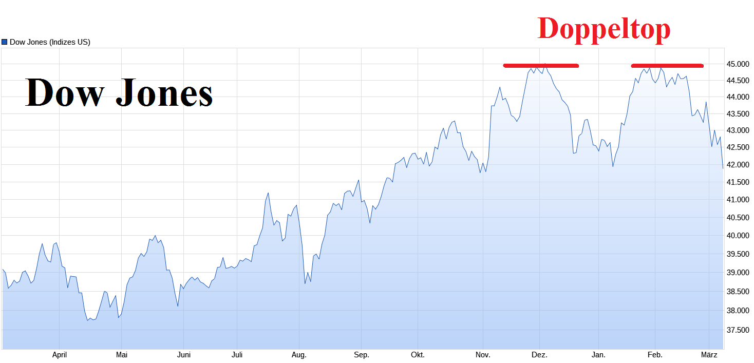 Die Doppeltop-Formation signalisiert eine Trendumkehr zum Abwärtstrend.