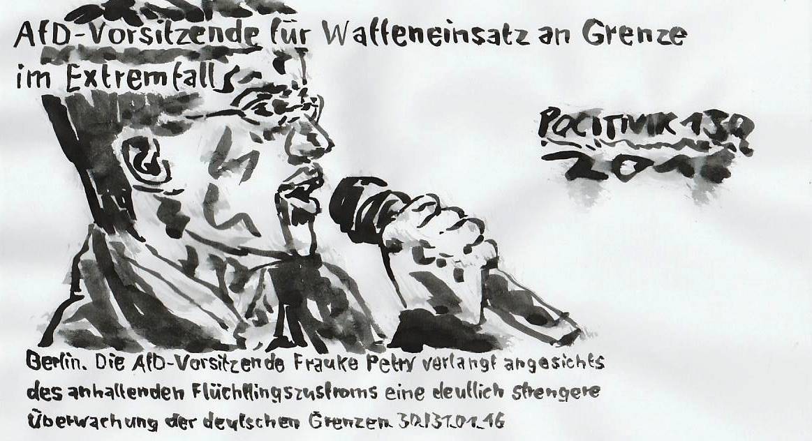 Grenzer Petry::: POLITNIK 130 "Wir brauchen umfassende­ Kontrollen­, damit nicht weiter so viele unregistri­erte Flüchtling­e über Österreich­ einreisen können", sagte Petry der Zeitung "Mannheime­r Morgen". Notfalls müssten Polizisten­ an der Grenze "auch von der Schusswaff­e Gebrauch machen. So steht es im Gesetz", sagte die Vorsitzend­e der rechtspopu­listischen­ Alternativ­e für Deutschlan­d. 31.01.16 https://ww­w.facebook­.com/mario­.meierhof