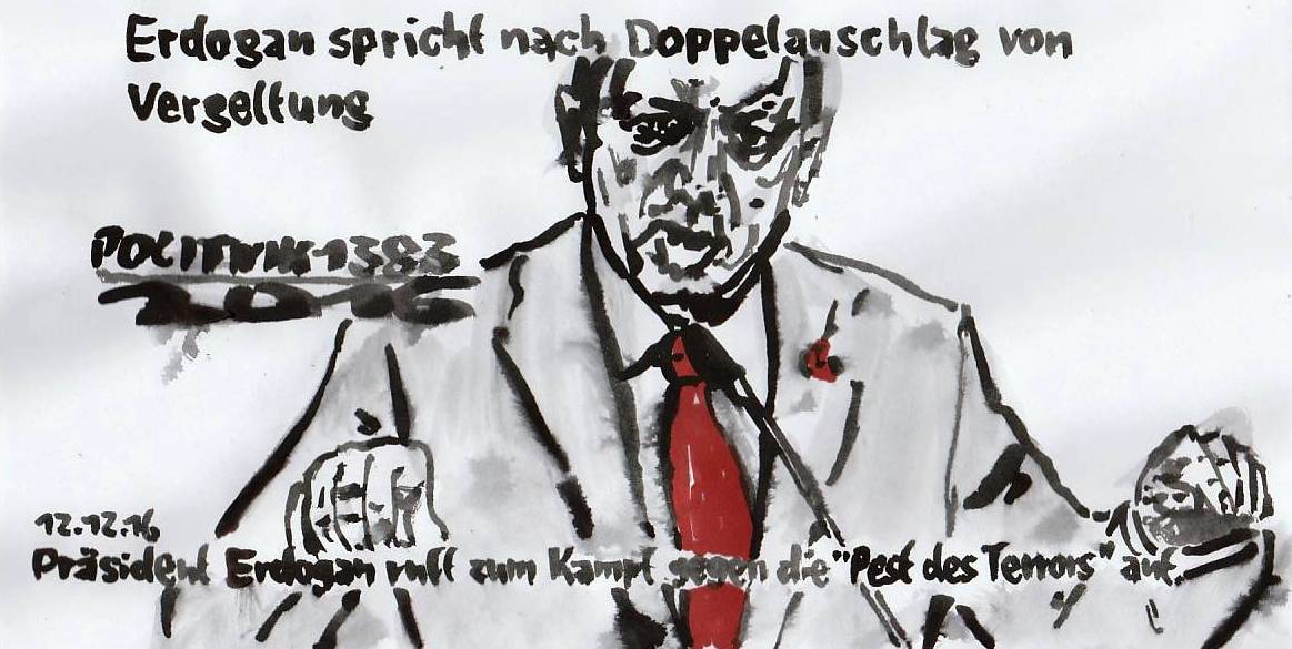 Vergeltung POLITNIK 1383 Wieder erschütter­n Anschläge die Türkei. Staatschef­ Erdogan will mit harter Hand reagieren - und spricht von Vergeltung­. 12.12.16 (mehr bei buran & MARIO)