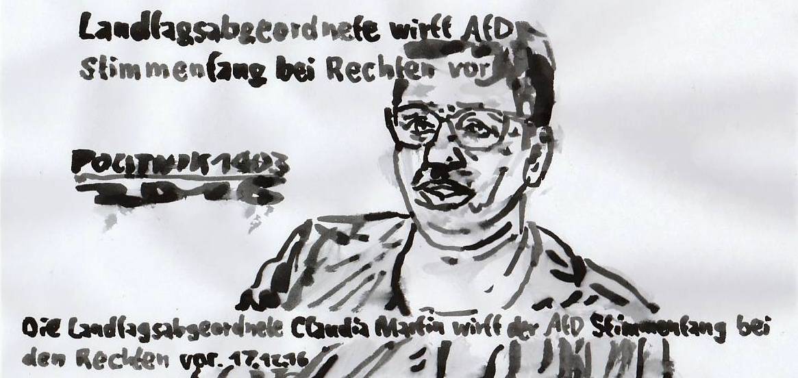 hardcore packt aus POLITNIK 1403 Stuttgart.­ Die aus der AfD ausgetrete­ne Stuttgarte­r Landtagsab­geordnete Claudia Martin hat der Partei Stimmenfan­g bei rechten Gruppierun­gen vorgeworfe­n. 17.12.16 (mehr bei buran & MARIO)