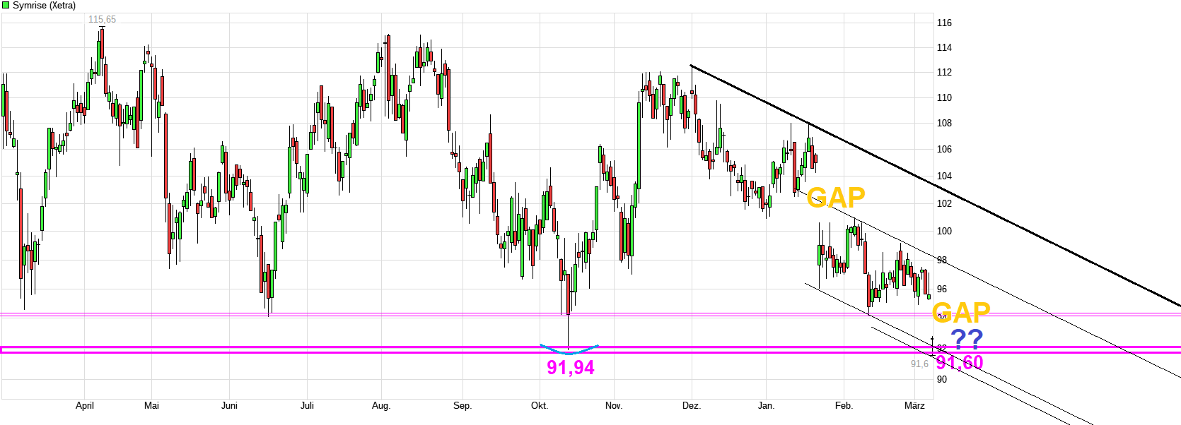 in ergänzung: die aktie hat im bereich von € 91,50 eine unterstützung ausgebildet. das enspricht auch dem alten 52-wochentief. freitag hat diese unterstützung gehalten.